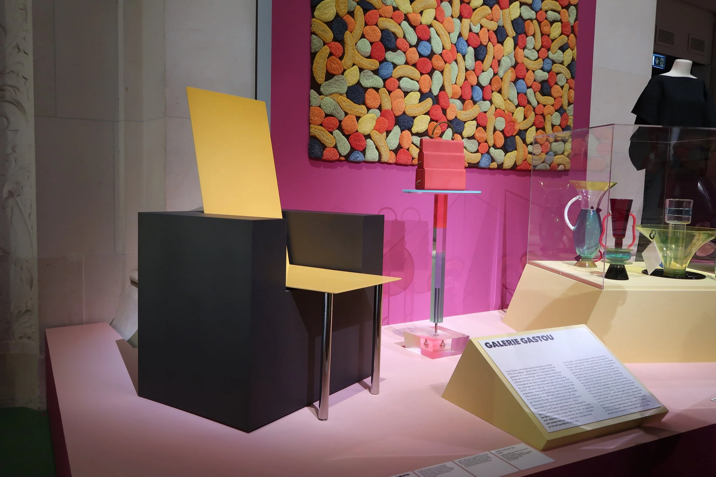 Le fauteuil Pilar (1985) de Nathalie du Pasquier lui fait écho, reprenant des pans laqués unis ou à motifs simplifiés très identifiables de ce style composite.